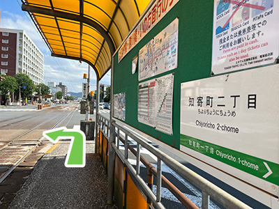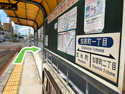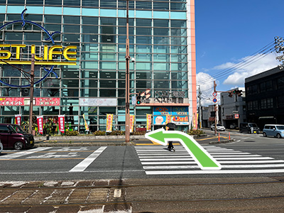 - ①「知寄町二丁目駅」を降りて、横断歩道を北側に渡り、突き当たりを左折します。