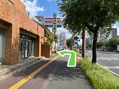 - ①「知寄町一丁目駅」を降りて、横断歩道を北側に渡り、突き当たりを右折します。