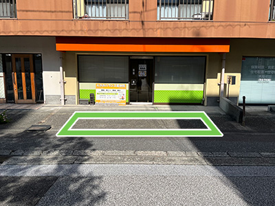 - ④右手すぐの所に、4階建てのマンション「コオキマンション」があり、そこの「1階テナント」です。 お車は、入口の前に「横向き」でお停めください。