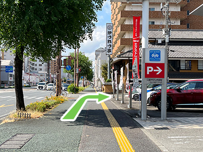 - ③そこから道なりに、南へ真っすぐ250mほど進むと、左手に「みどり色の電柱看板」がありますので、そこを左折します。
